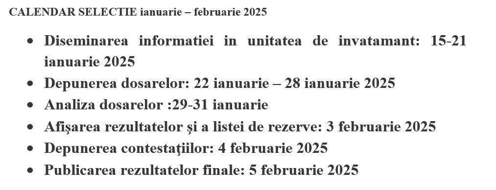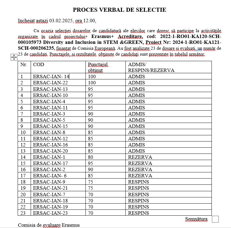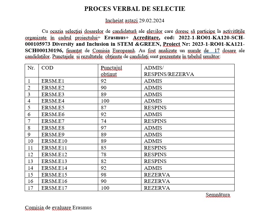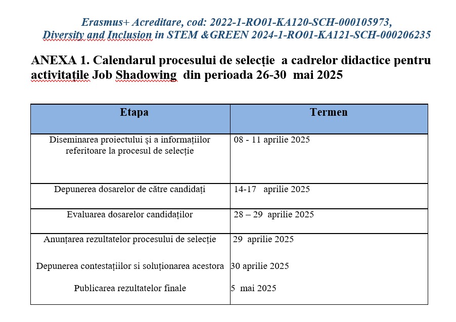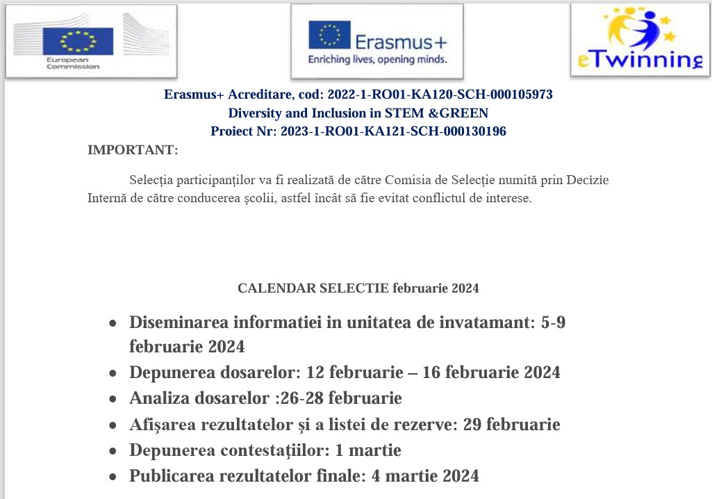 In cadrul Acreditarii Erasmus se realizeaza selectia a 8 elevi si 4 rezerve pentru mobilitatea din Atena in perioada 1-5 aprilie 2024 conform urmatorului calendar. Procedura de selectie si calendarul sunt atasate.