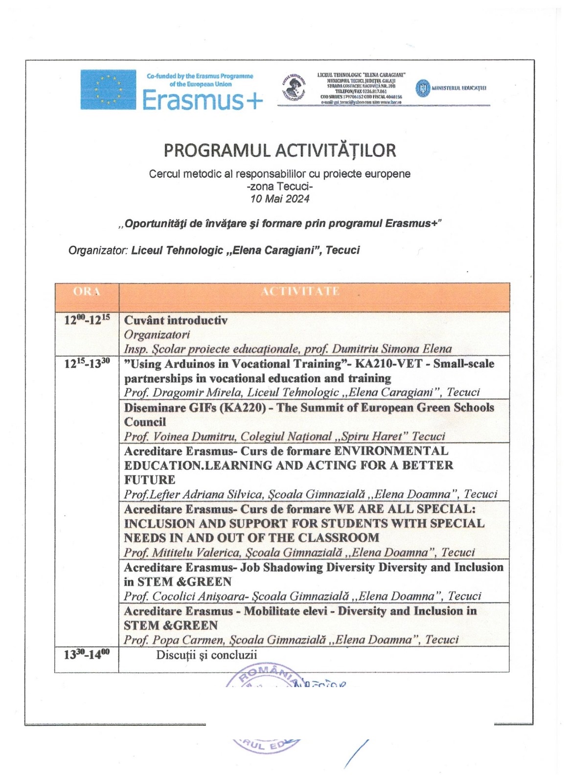 Rezultatele Acreditării Erasmus 2023-2024 au fost diseminare in cadrul Cercului Metodic a Managerilor Școlari din zona Tecuci cu participarea Membrilor Inspectoratului Școlar Judetean Galati cu tema Dezvoltarea mecanismelor instituționale ale unităților școlare din perspectiva managementului de proiect - o metodă de eficientizare a activităţii instituţiei şcolare