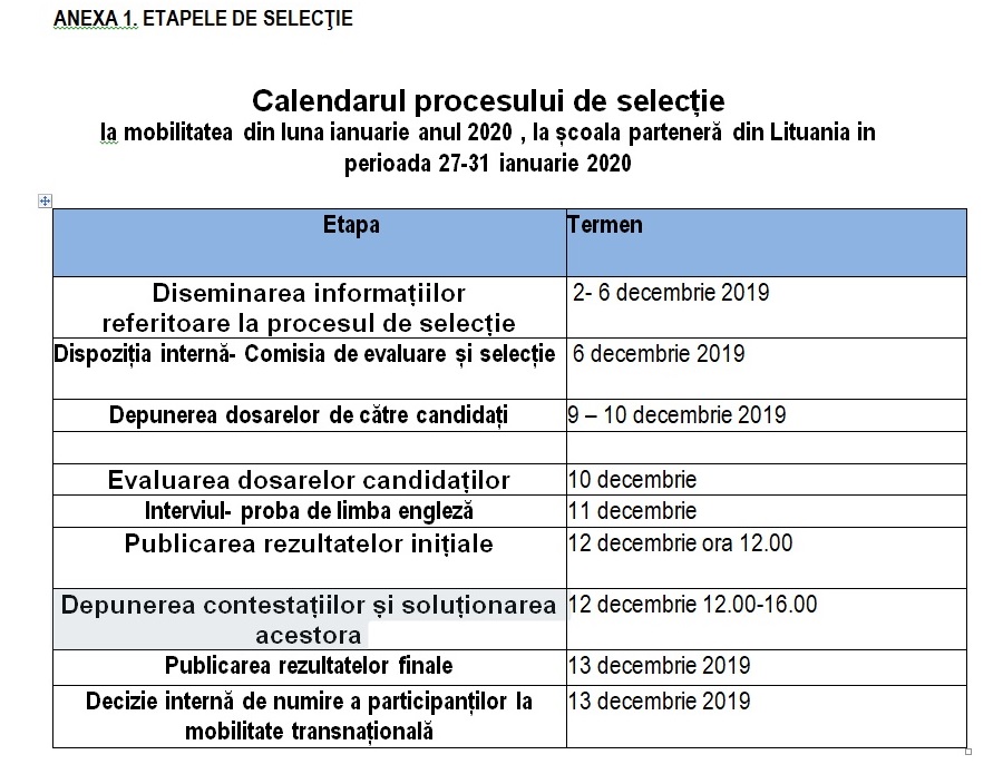 A fost implementata procedura de selectie a elevilor din invatamantul gimnaziala pentru Mobilitatea LTT din Lituania din luna ianuarie, 6 elevi si 3 profesori vor participa la aceasta intalnire.